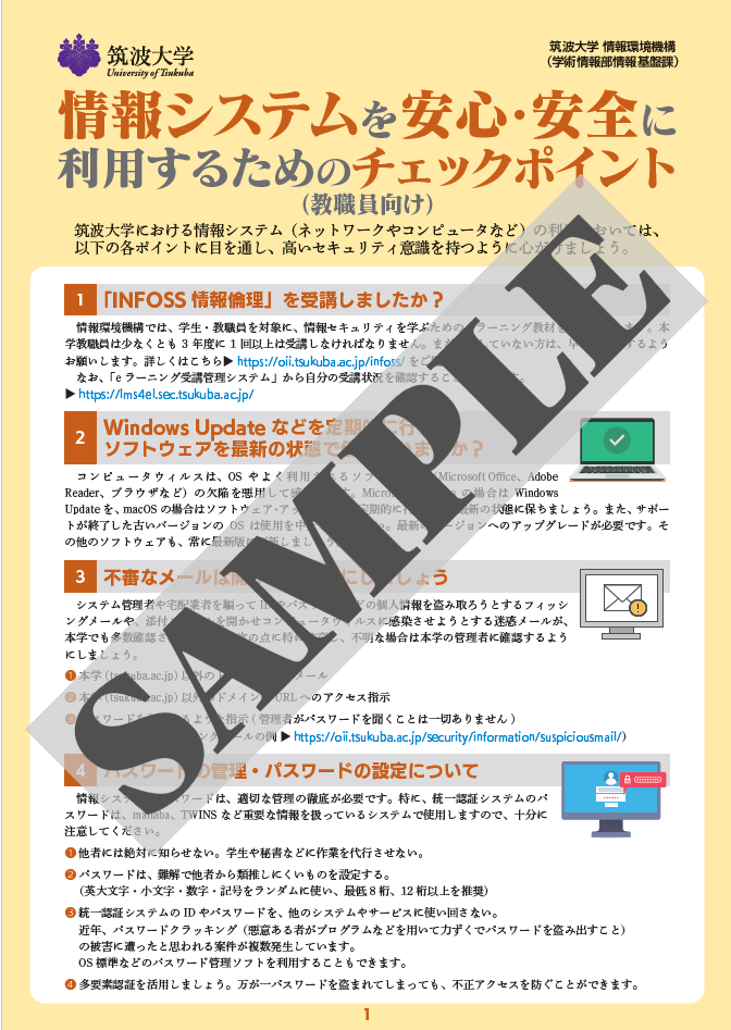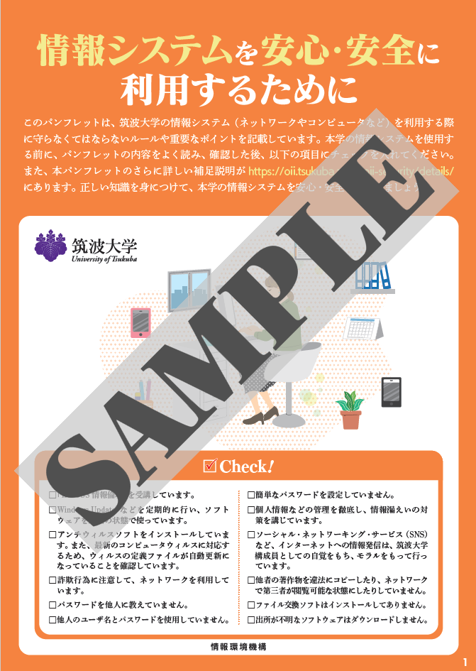 情報システムを安心・安全に利用するために 構成員の皆様が情報システムを安心・安全に利用できるよう、情報環境機構では情報セキュリティパンフレットを発行しています。 学生向け 情報セキュリティパンフレット 情報システムを安心・安全に利用するために ・日本語(PDF) ・英語(PDF) ・中国語(PDF) → 補足説明ページもご覧ください: こちら から 教職員向け 情報セキュリティパンフレット 情報システムを安心・安全に利用するためのチェックポイント ・日本語(PDF) ・英語(PDF)